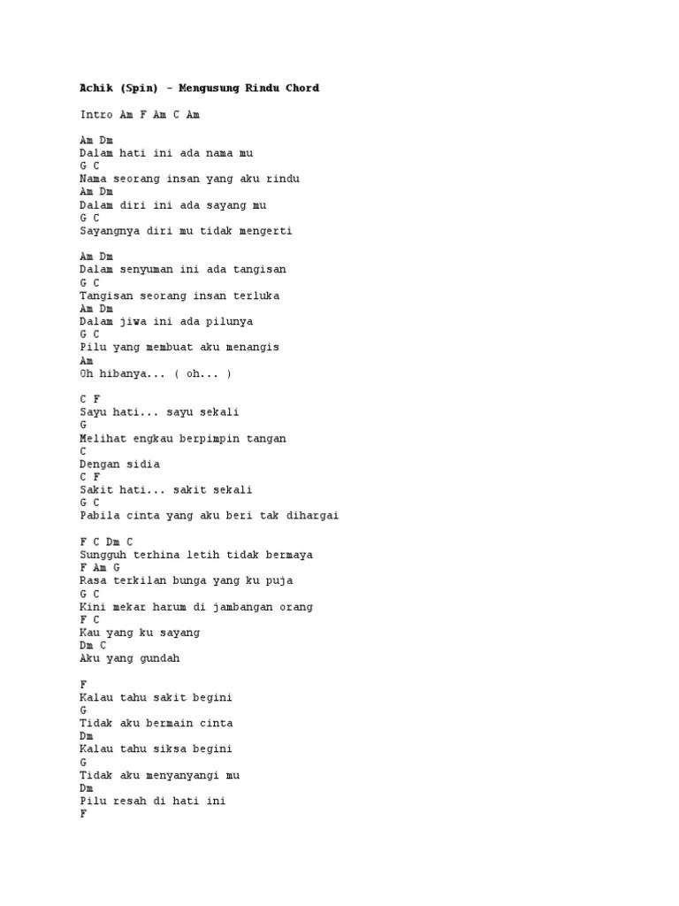 Intro gm eb gm bb gm gm cm dalam hati ini ada nama mu. Gm cm dalam diri ini ada sayang mu Tabs and sheet music search engine. Salah satunya adalah lagu " mengusung rindu " yang di bawakan oleh band spin dari malaysia lagu ini. Nama seorang insan yang aku rindu